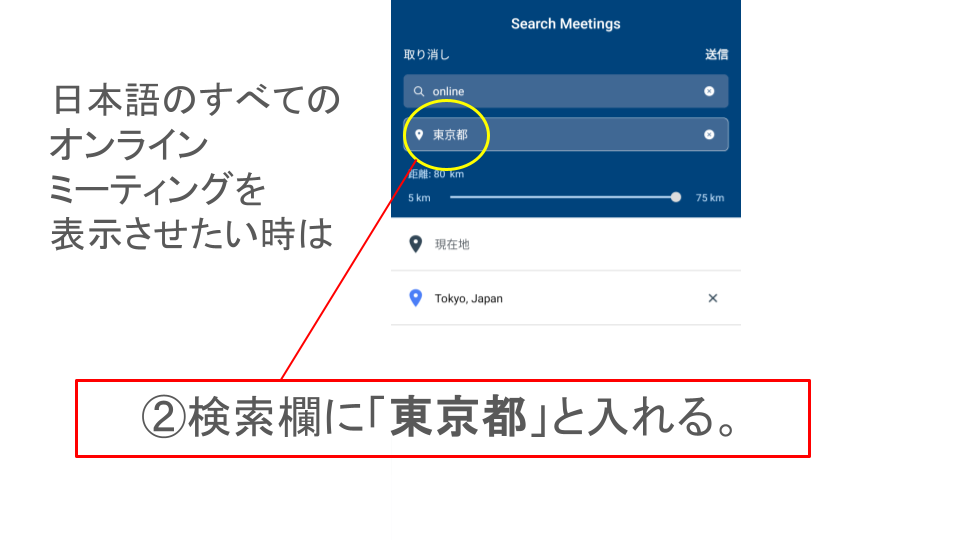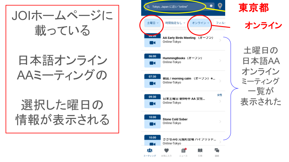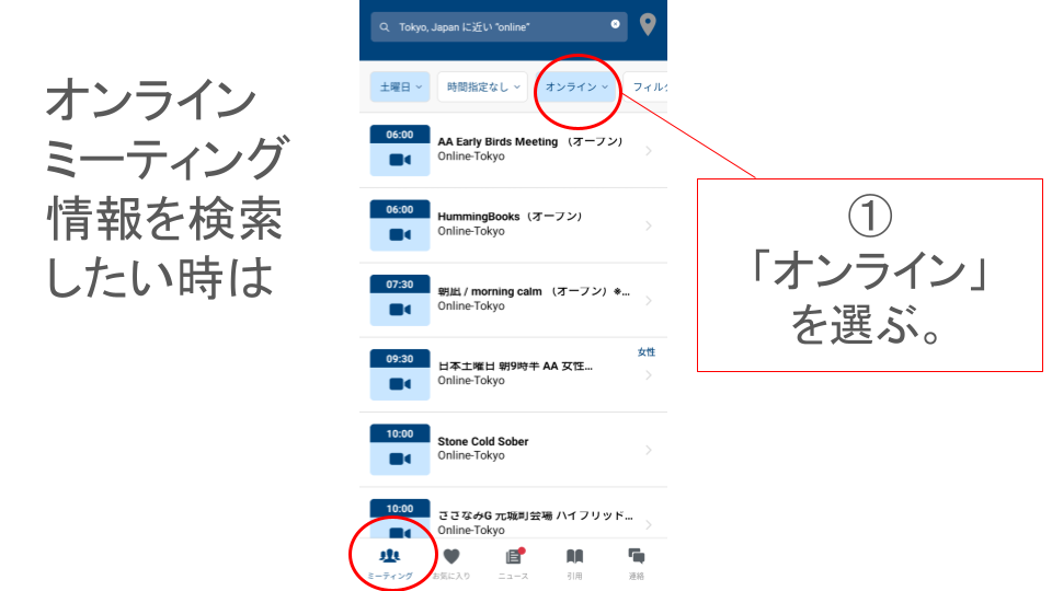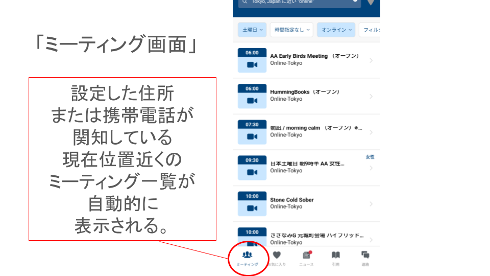 ※一部の表現については、アプリ内で日本語化されていない場合があります。予めご了承ください。また本ページの内容は、AA公式サイトの Meeting Guide から引用しています。