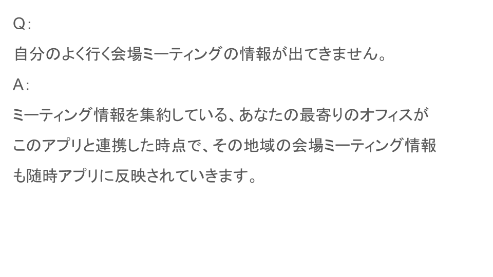 ミーティングガイドは地域、地区、インターグループ/セントラルオフィス、および世界のゼネラルサービスオフィスの Web サイトと同期し、400 を超える AA サービス の 実在のミーティング一覧をアプリに中継しています。現在、毎週 100,000 件を超えるミ ーティングが一覧化されており情報は 1 日に 2 回更新されます